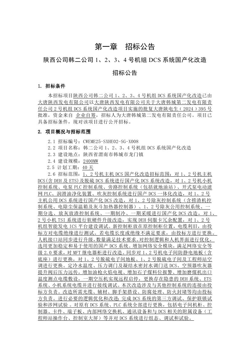 陕西公司韩二公司 1、2、3、4号机组 DCS系统国产化改造招标公告