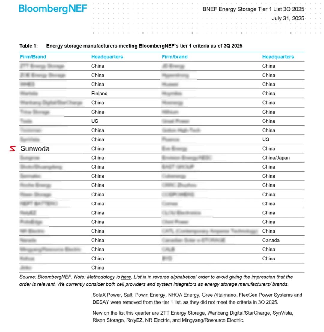 近日,彭博新能源财经(BloombergNEF,以下简称“BNEF”) 发布2025年第三季度全球Tier 1一级储能厂商榜单。凭借高可靠的储能产品、高稳定的项目交付能力和稳健的可融资实力,欣旺达再次强势登榜,蝉联全球一级储能厂商,持续赢得全球用户与资本市场的高度信赖。