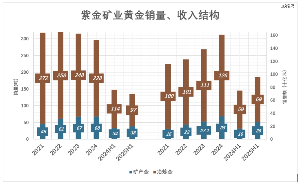 2025年H1,矿产金、冶炼金销量分别为38吨、997吨,矿产金占比28.2%;销售额分别为265亿、694亿,矿产金占比27.6%;