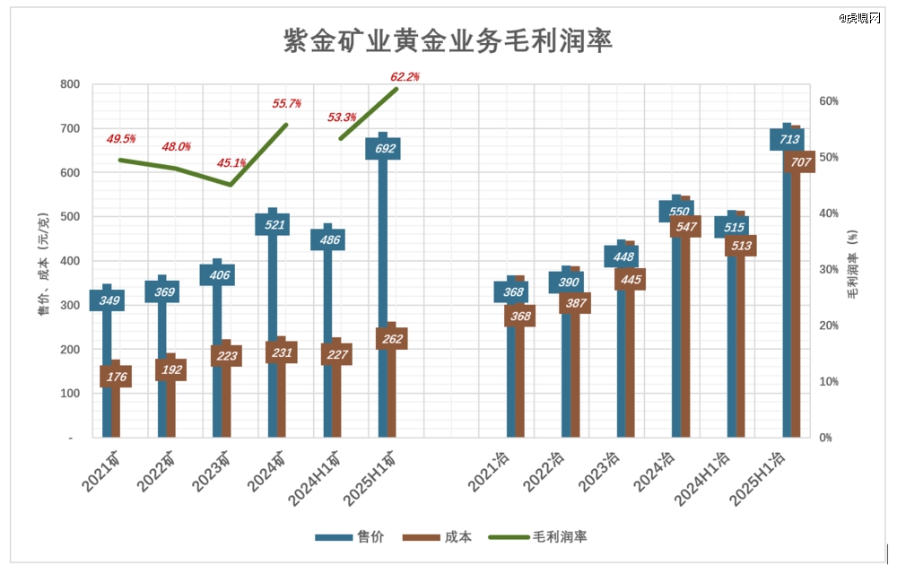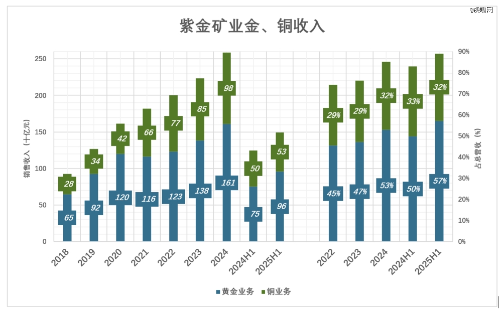 2025年H1,黄金、铜业务收入分别为959亿、533亿,分别占总营收的57.2%、31.8%;