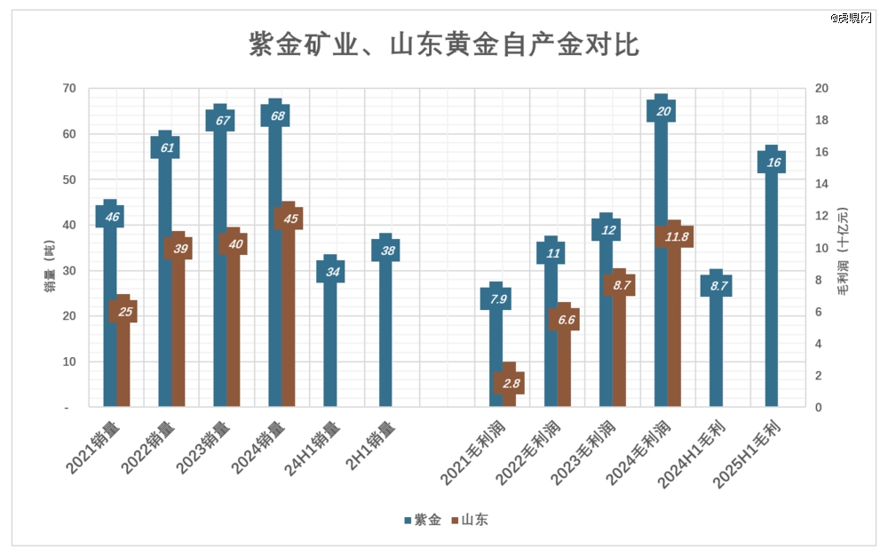 到2024年,山东黄金矿山产金销量达67.8吨,山东黄金自采销量45.2吨,相当于紫金的66.7%;毛利润118亿、相当于紫金的60%。