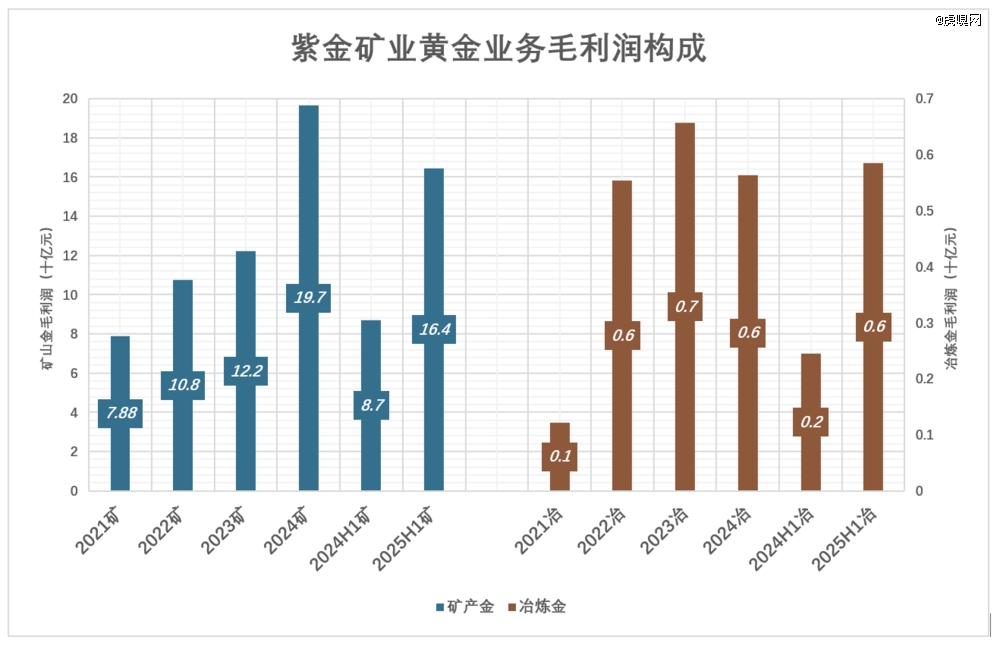 2024年,矿产金销售额353亿、毛利润197亿;冶炼金销售额高达1255亿(占总营收的41.3%)、毛利润仅5.6亿,占黄金业务毛利润的1.8%。