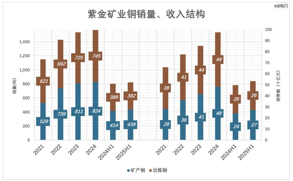2025年H1,矿产铜、冶炼铜销量分别为43.9万吨、38.2万吨,矿产铜占53.5%;销售额分别为273亿、261亿,矿产铜占比51.1%;