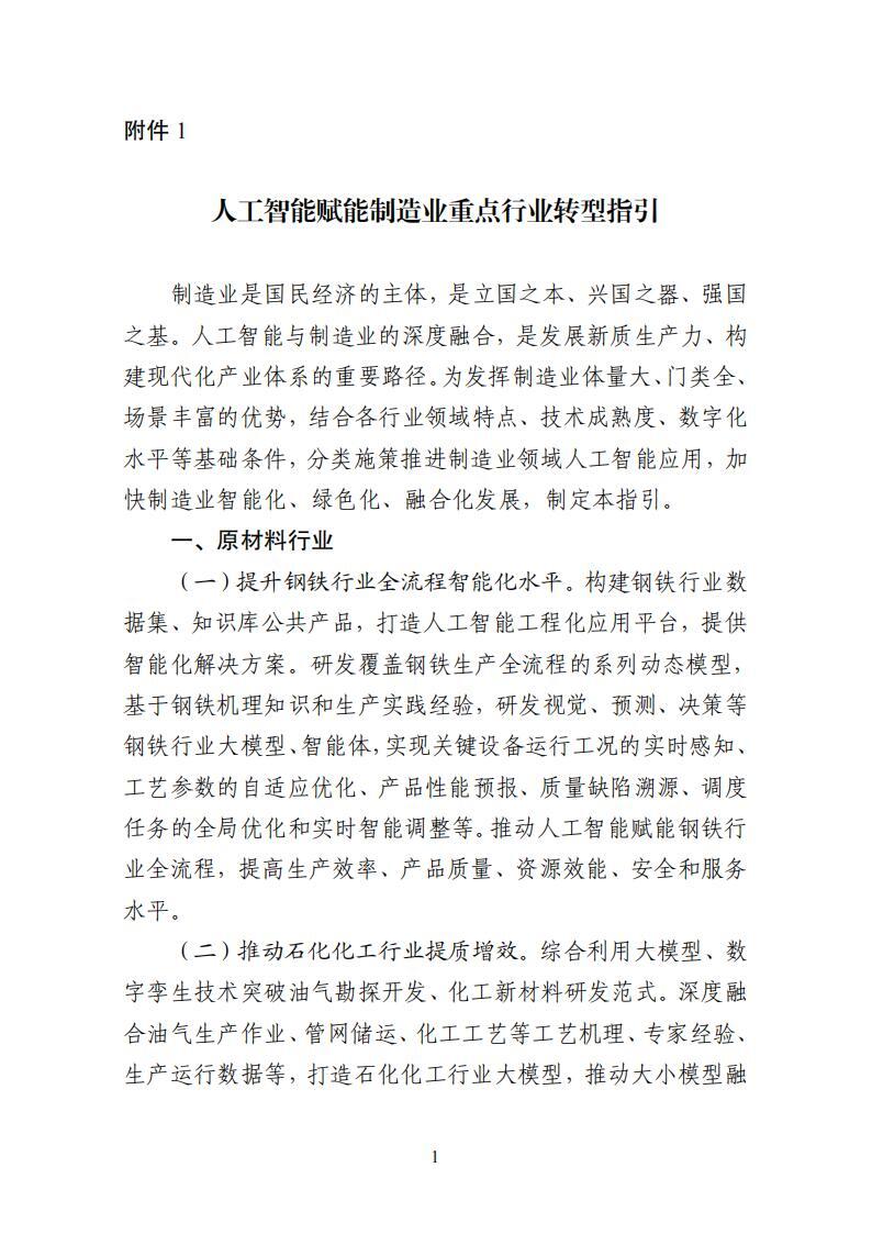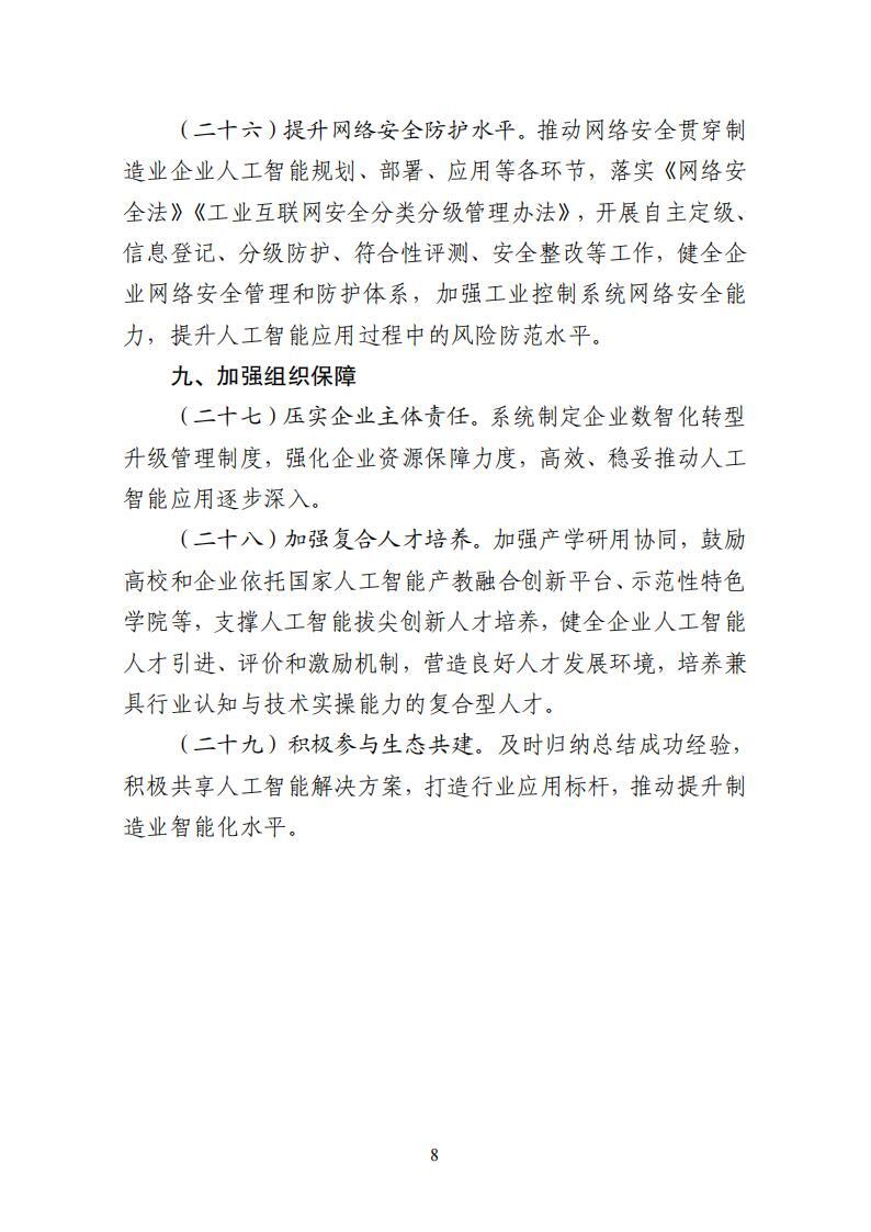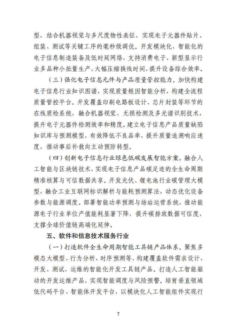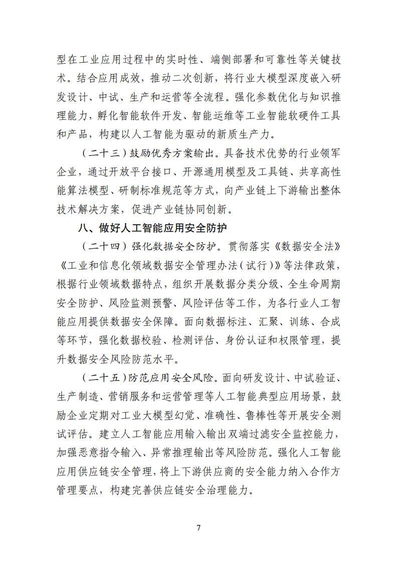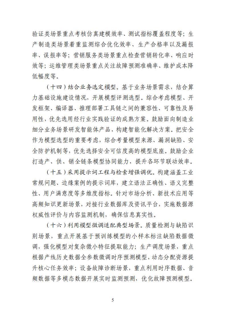 文件指出,深化人工智能技术在绿色制造领域融合应用,针对能源和碳排放管理、资源循环利用等场景需求,研发推广智能化绿色化协同解决方案。打造一批面向行业的应用安全解决方案,加快安全大模型、智能体等落地应用,构建安全运行体系,提升工业领域安全水平。