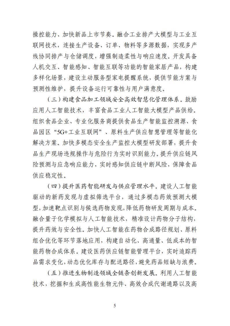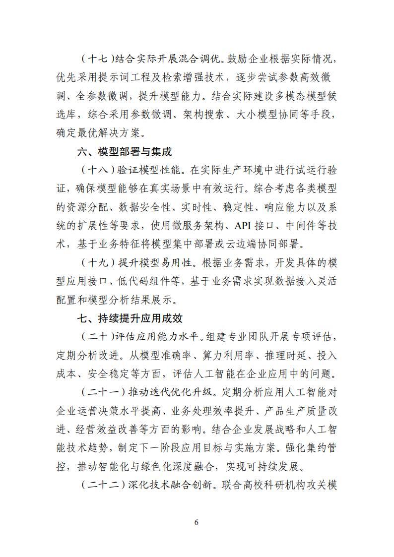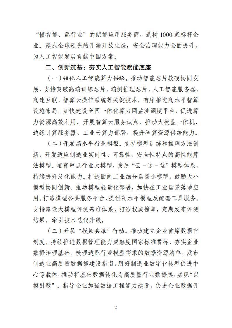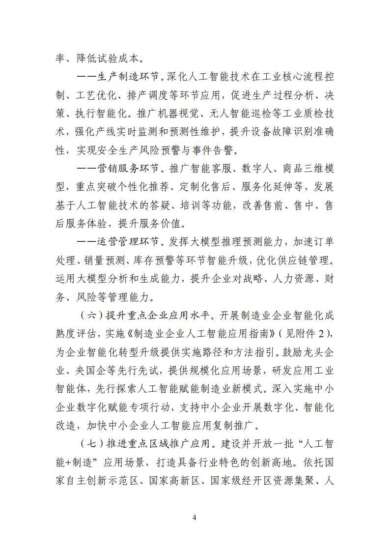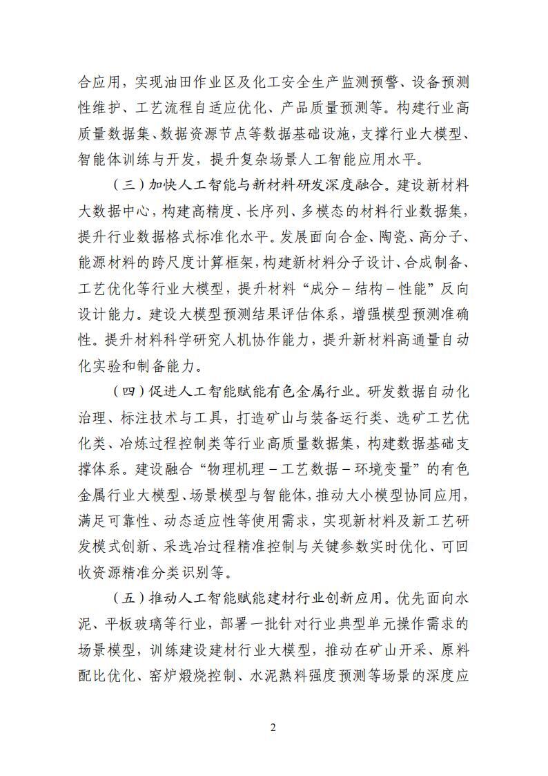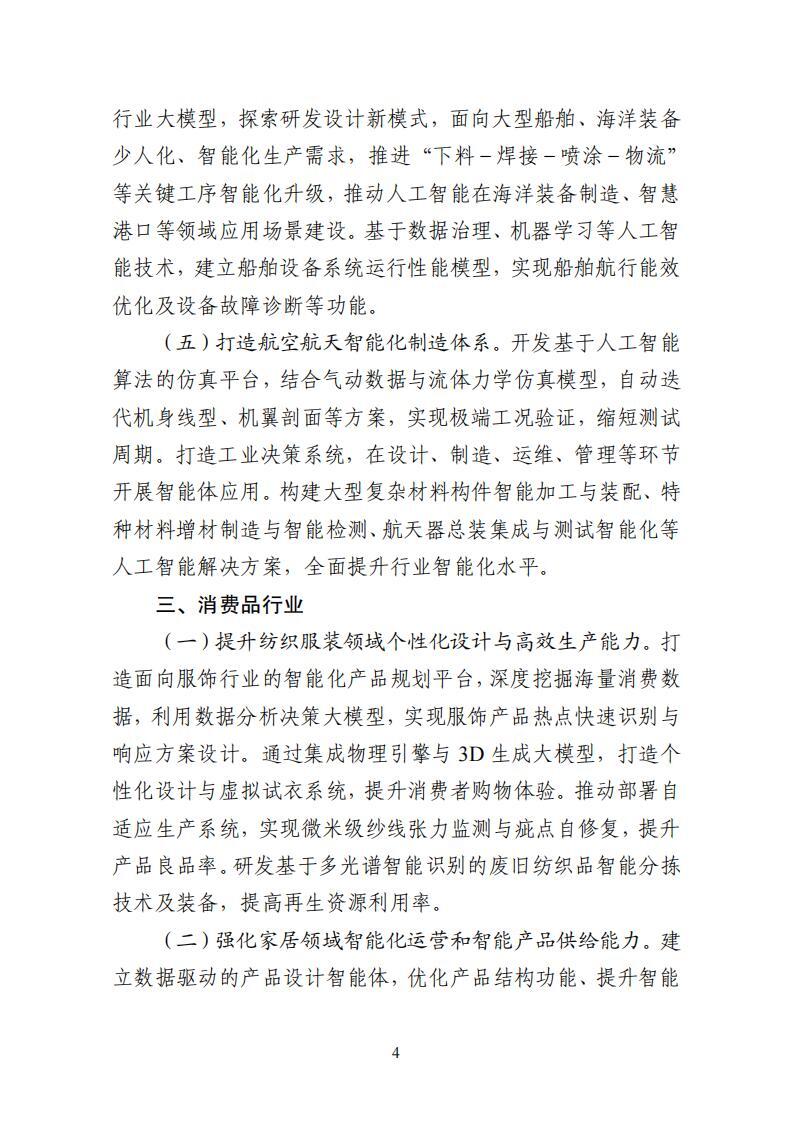 文件指出,深化人工智能技术在绿色制造领域融合应用,针对能源和碳排放管理、资源循环利用等场景需求,研发推广智能化绿色化协同解决方案。打造一批面向行业的应用安全解决方案,加快安全大模型、智能体等落地应用,构建安全运行体系,提升工业领域安全水平。
