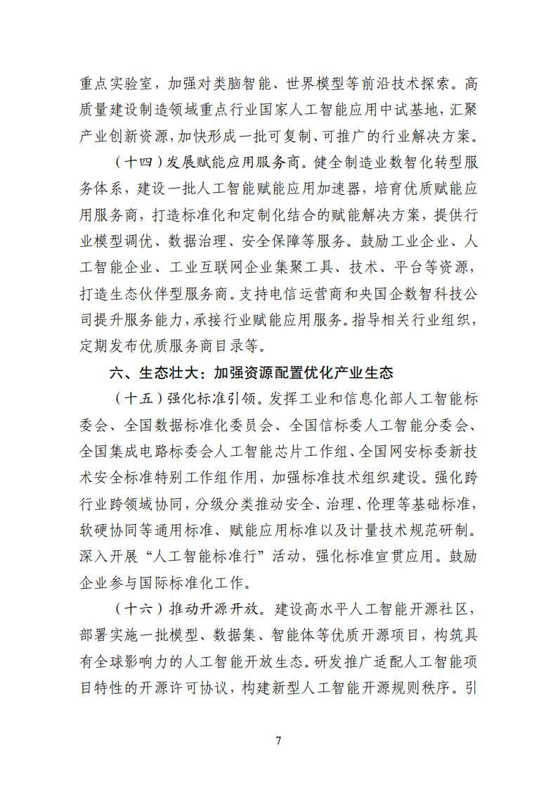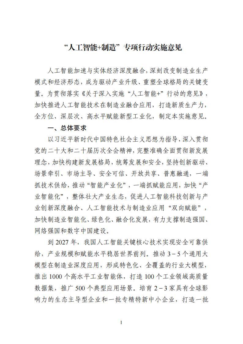 1月7日,工业和信息化部 中央网信办 国家发展改革委 教育部 商务部 国务院国资委 市场监管总局 国家数据局联合发布关于《“人工智能+制造”专项行动实施意见》的通知。