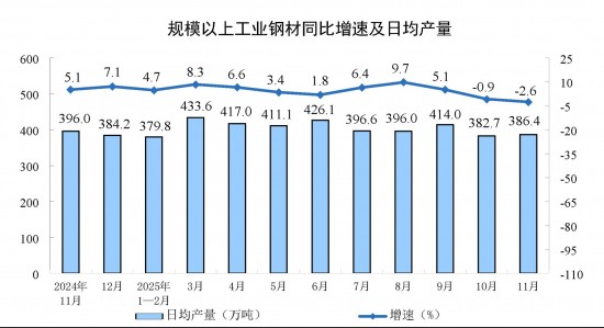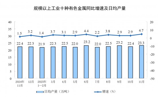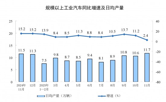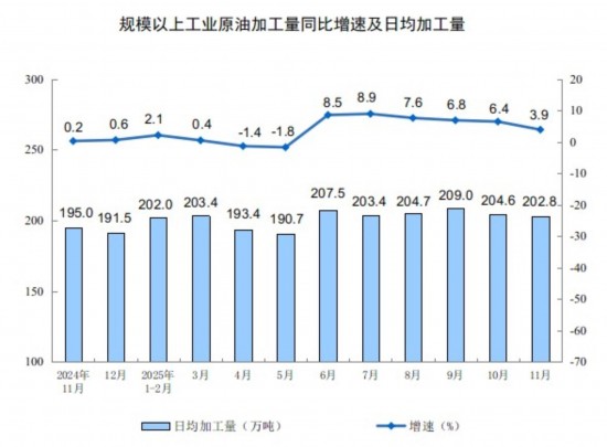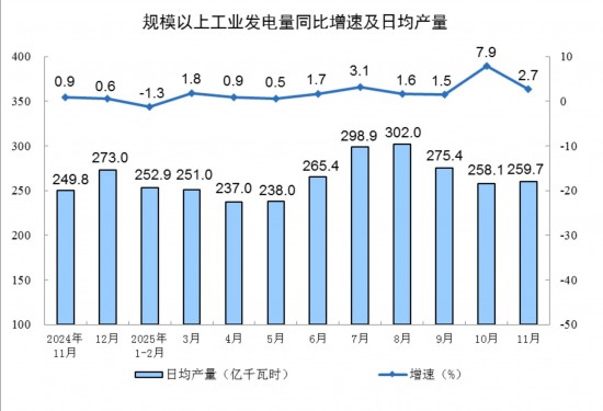 分产品看,11月份,规模以上工业623种产品中有310种产品产量同比增长。其中,钢材11591万吨,同比下降2.6%;水泥15434万吨,下降8.2%;十种有色金属699万吨,增长4.7%;乙烯309万吨,增长7.3%;汽车351.9万辆,增长2.4%,其中新能源汽车184.1万辆,增长17.0%;发电量7792亿千瓦时,增长2.7%;原油加工量6083万吨,增长3.9%。