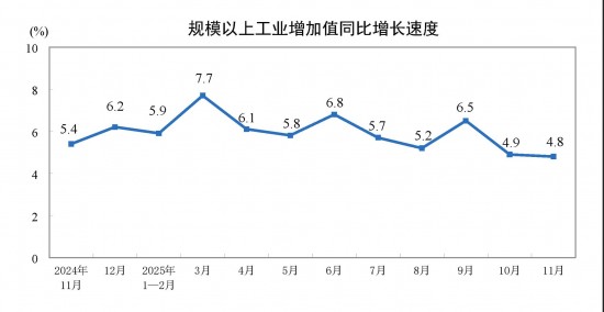 11月份,规模以上工业增加值同比实际增长4.8%(增加值增速均为扣除价格因素的实际增长率)。从环比看,11月份,规模以上工业增加值比上月增长0.44%。1—11月份,规模以上工业增加值同比增长6.0%。