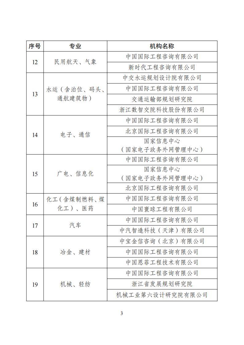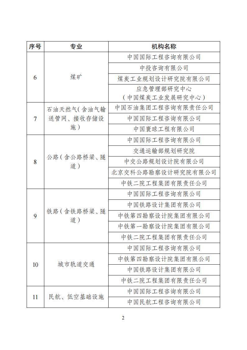 其中,中国国际工程咨询有限公司、电力规划总院有限公司、中投咨询有限公司、中国寰球工程有限公司、水电水利规划设计总院、中国石油集团工程咨询有限责任公司、中国核电工程有限公司、国网经济技术研究院有限公司、中国电力企业联合会电力建设技术经济咨询中心、煤炭工业规划设计研究院有限公司、应急管理部研究中心(中国煤炭工业发展研究中心)等入选水电、新能源、核电、电网工程、煤矿、石油天然气专业咨询机构。