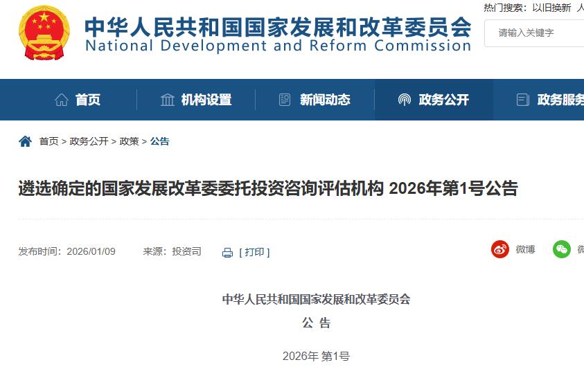 近日,国家发展和改革委员会发布遴选确定的国家发展改革委委托投资咨询评估机构 2026年第1号公告。