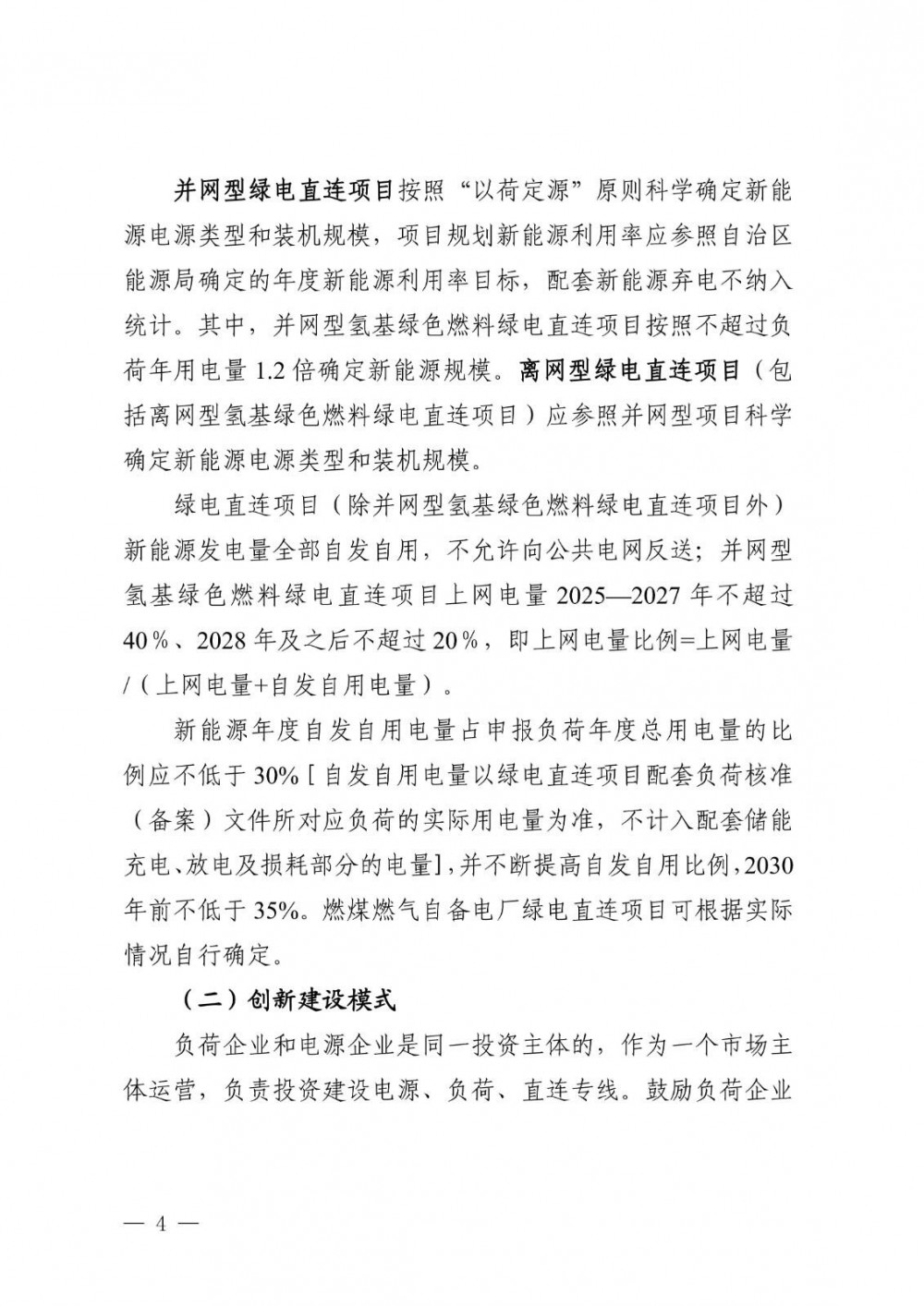 绿电直连项目(除并网型氢基绿色燃料绿电直连项目外)新能源发电量全部自发自用,不允许向公共电网反送;并网型氢基绿色燃料绿电直连项目上网电量2025—2027年不超过40%、2028年及之后不超过20%,即上网电量比例=上网电量/(上网电量+自发自用电量)。