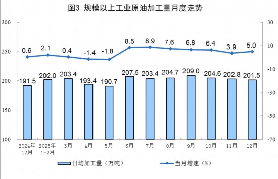 原油加工增速加快。12月份,规上工业原油加工量6246万吨,同比增长5.0%,增速比11月份加快1.1个百分点;日均加工量201.5万吨。