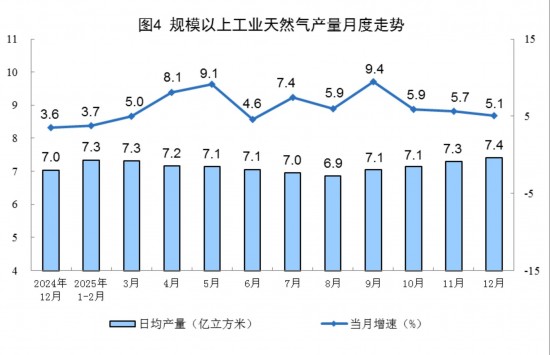 天然气生产平稳增长。12月份,规上工业天然气产量230亿立方米,同比增长5.1%;日均产量7.4亿立方米。