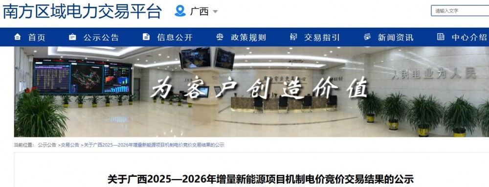 关于广西2025—2026年增量新能源项目机制电价竞价交易结果的公示