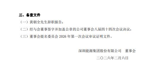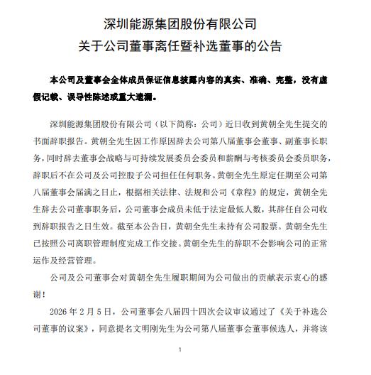 2月6日,深圳能源发布关于公司董事离任暨补选董事的公告。